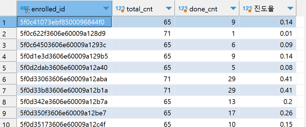퀴즈4) 수강등록정보(enrolled_id)별 전체 강의 수와 들은 강의의 수, 그리고 진도율 출력해보기