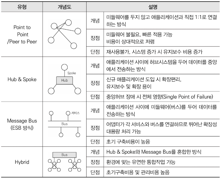 - Message Bus(ESB방식) : 미들웨어를 사용하여 애플리케이션 사이에서 메시지를 전달