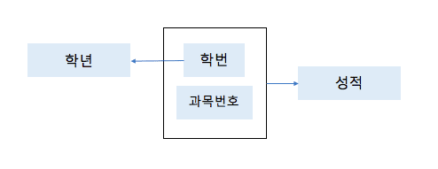 - 이행적 함수 종속 : X->Y, Y->Z 이러한 종속 관계가 있을 경우, X->Z 성립