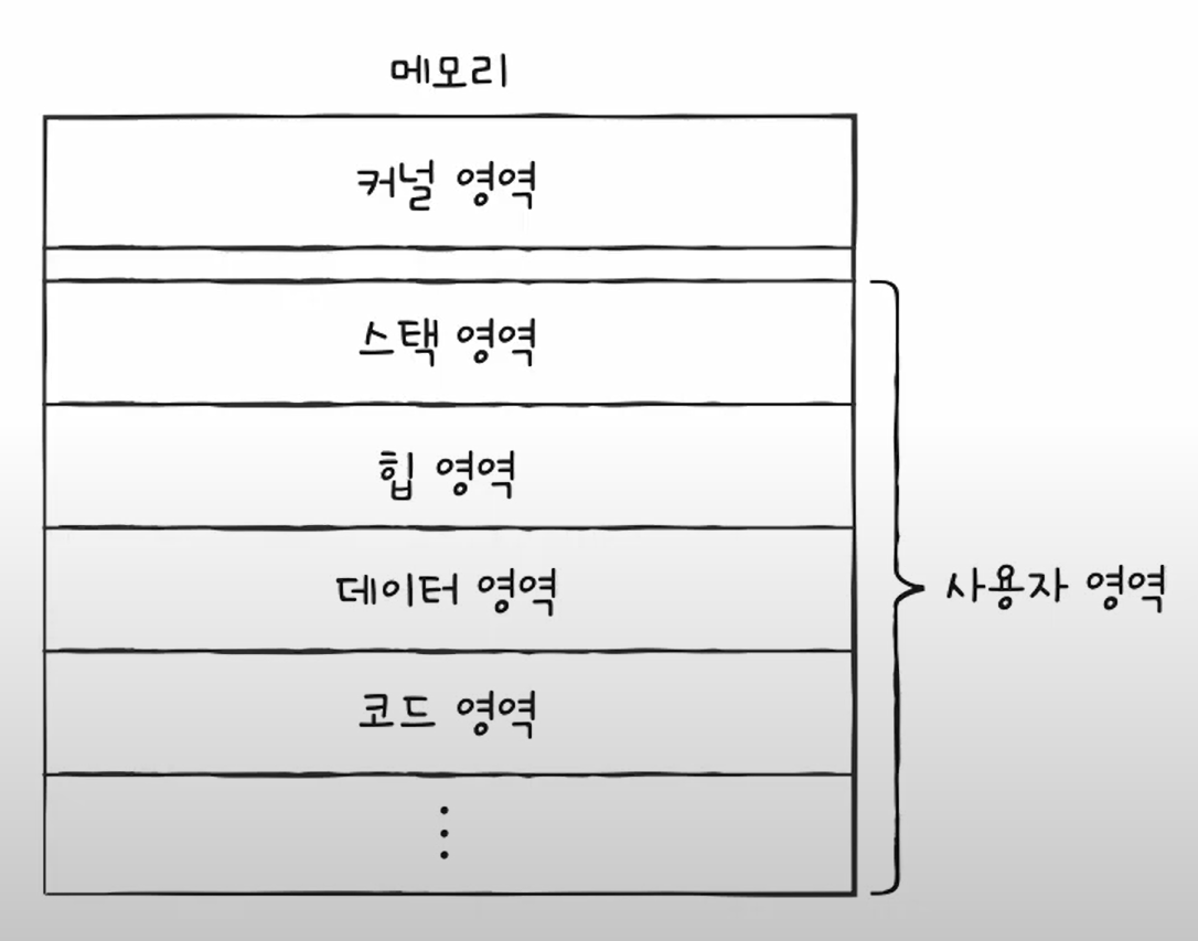 - 사용자 영역에는 크게 코드영역(= 테스트 영역), 데이터 영역, 힙 영역, 스택 영역