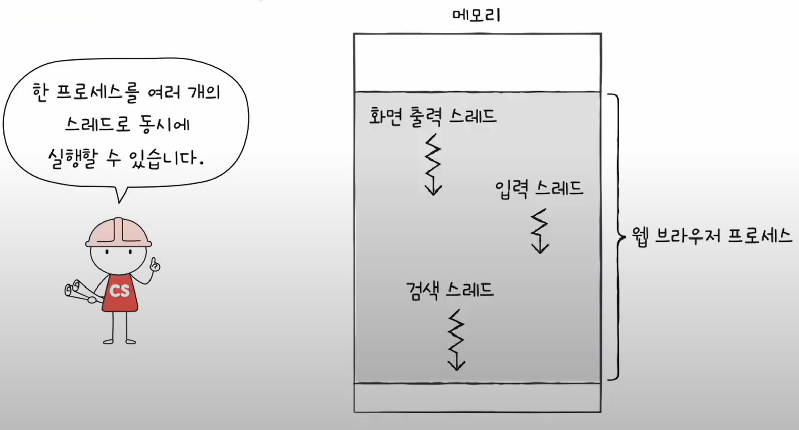 - 하나의 프로세스는 하나 이상의 스레드를 가질 수 있다.