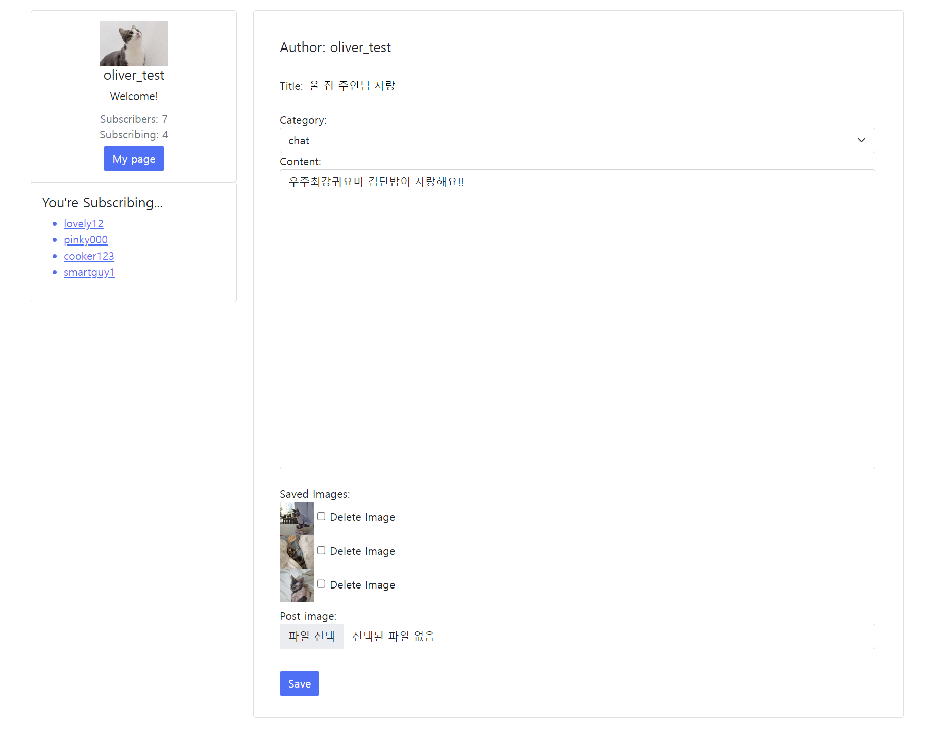 이후, 사진 업로드 및 수정 기능, 카테고리 기능, 구독한 유저의 글 모아보기 기능도 추가했다!