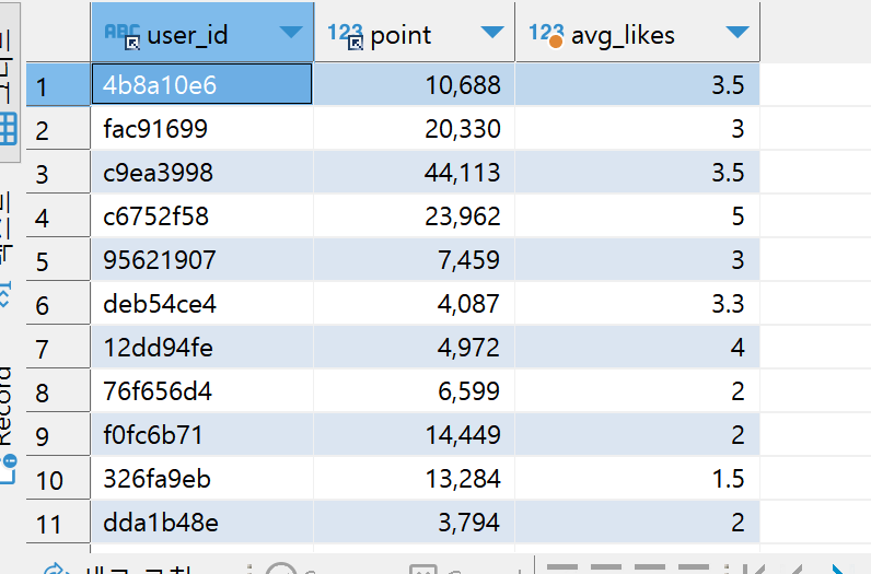예3) from절 : 유저 별 좋아요 평균과 유저 별 포인트를 보자 (포인트와 like의 상관관계?)