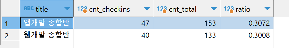 예8) from 절: 강의 제목별 checkin개수, 전체인원, 체크인 비율 나타내기
