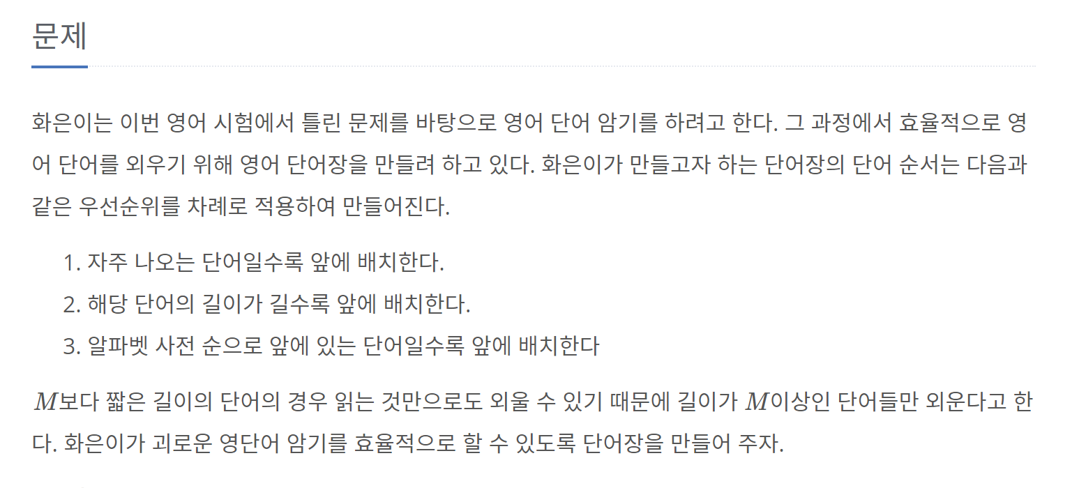 N, M = map(int, input().rstrip().split()) # 단어 개수, 기준이 되는 길이